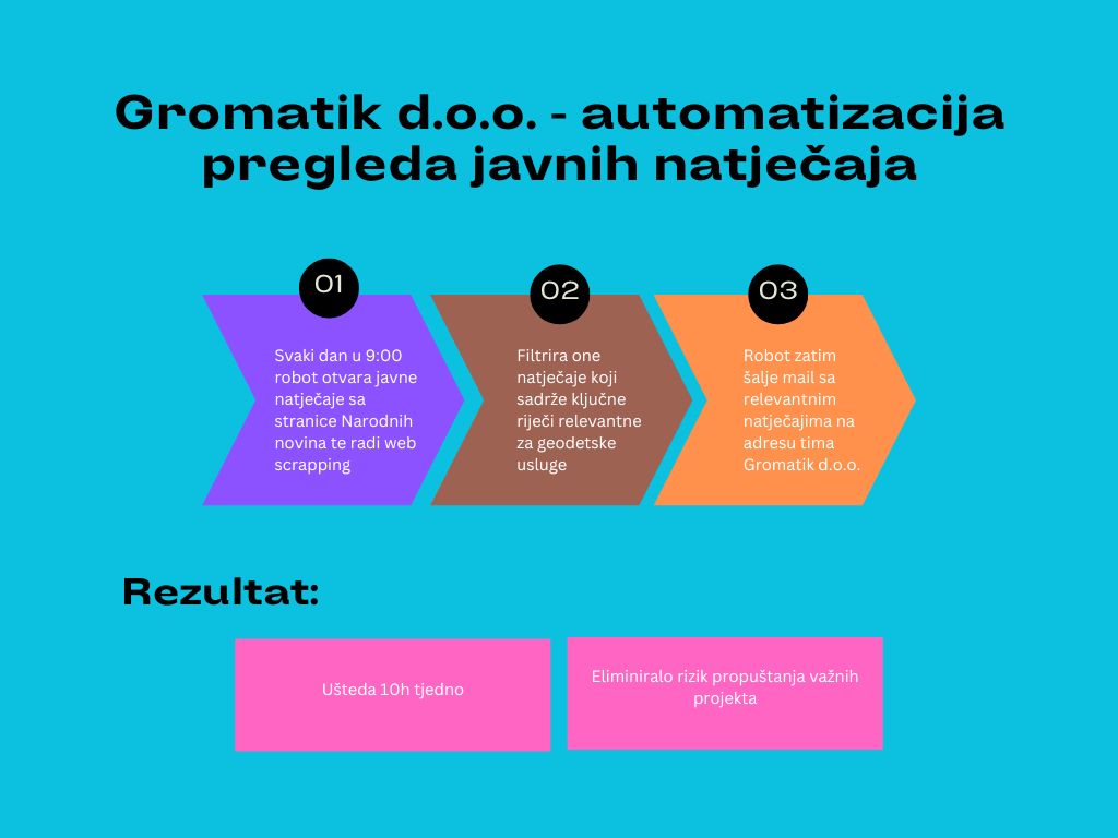 Firma za geodeziju imala je poteškoća u praćenju relevantnih natječaja i projekata. Ručno pretraživanje internetskih stranica oduzimalo je puno vremena, a važno je bilo pratiti samo specifične projekte relevantne za geodetska posla. Kreirali smo rješenje kombinacijom Pythona i IU Path.
